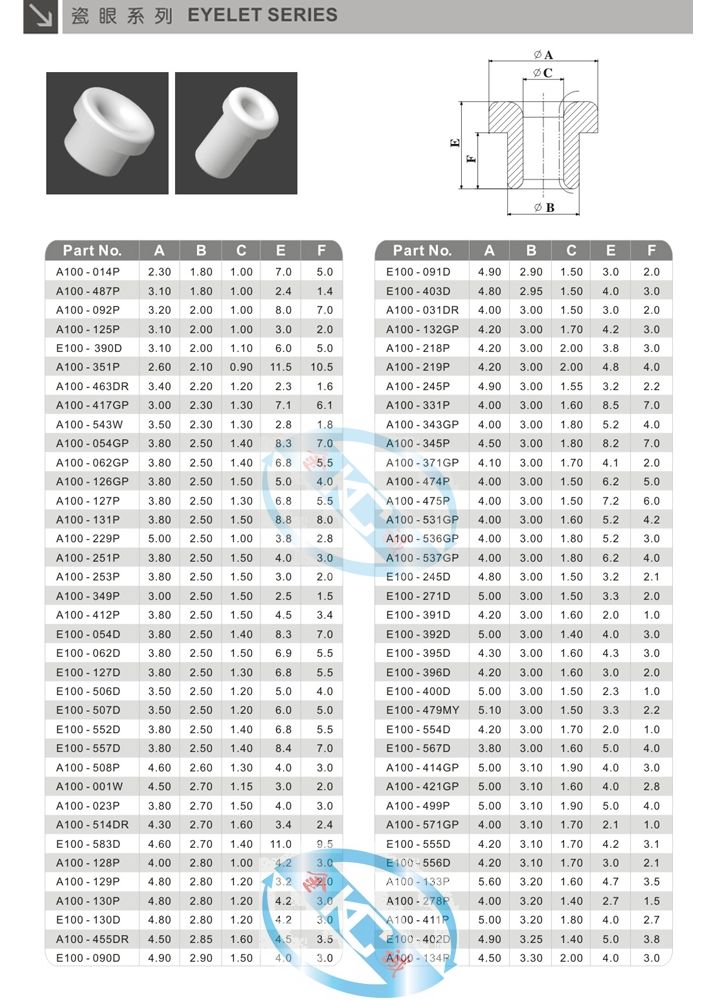 陶瓷瓷眼:陶瓷瓷眼應用于繞線機及紡織機械中的過絲部位,是最常用的過絲另件,用于要求不高的過絲場合。工作時,絲線在瓷眼表面滑動,為了降低摩擦力,必須提高材料的硬度,光潔度及形狀。本公司選用99%的Al2O3,硬度大于HRa88,密度3.85,超精拋Ra0.2。