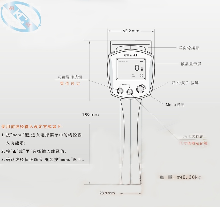 表面按鍵設(shè)計簡捷、大方,菜單清晰明了易于操作,測量結(jié)果直接顯示張力值并有最大、最小值同步顯示,具有掉電記憶功能。