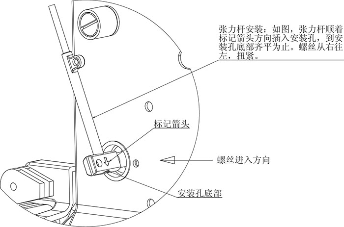 1、安裝:將該產(chǎn)品的安裝孔安裝在Φ16的柱子上,并鎖緊五星手輪;將張力桿按照張力竿轉(zhuǎn)接軸上箭頭方向插入與軸齊平,轉(zhuǎn)動張力桿使得拉簧掛鉤處于合適的位置,鎖緊螺絲(詳見圖四所示)。