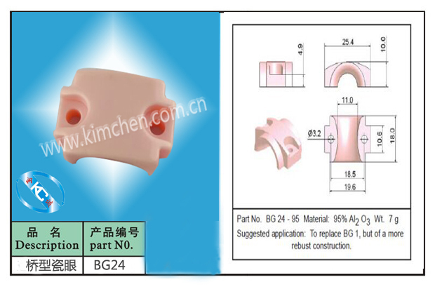 陶瓷瓷眼:橋型瓷眼BG24屬于陶瓷瓷眼一種,應用于繞線機及紡織機械中的過絲部位,是最常用的過絲另件,用于要求不高的過絲場合。工作時,絲線在瓷眼表面滑動,為了降低摩擦力,必須提高材料的硬度,光潔度及形狀。本公司選用99%的Al2O3,硬度大于HRa88,密度3.85,超精拋Ra0.2。